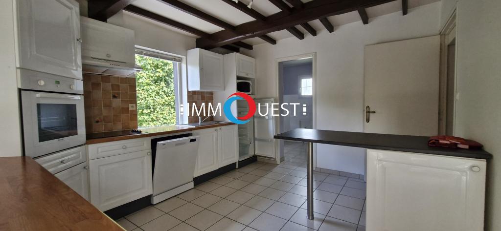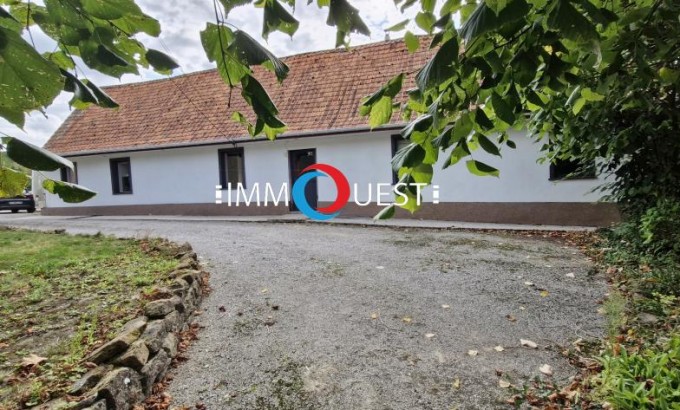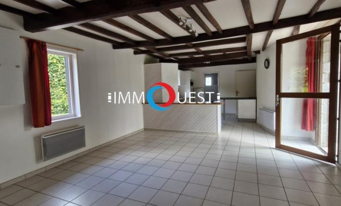 Maison de campagne avec vie de plain pied comprenant un salon séjour avec cheminée feux de bois, une cuisine meublée et équipée, deux chambres, salle de bains avec baignoire et douche, un WC, un cellier, une cave.