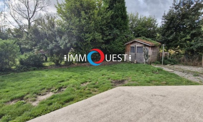 Terrasse et pelouse à l'arrière de la maison avec abri à bois et parking sur l'avant de la maison.