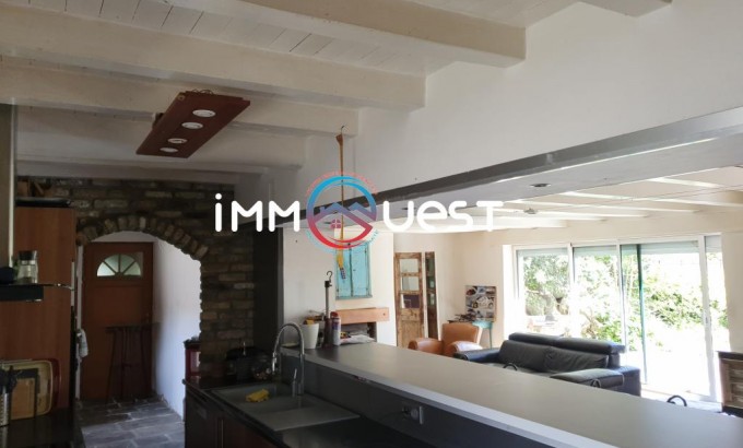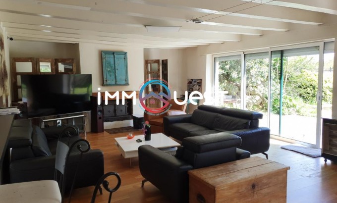 Entrée avec espace bureau, salle de bains, WC, suite parentale, cuisine aménagée et équipée ouverte sur une pièce de vie lumineuse avec cheminée, cellier, cave