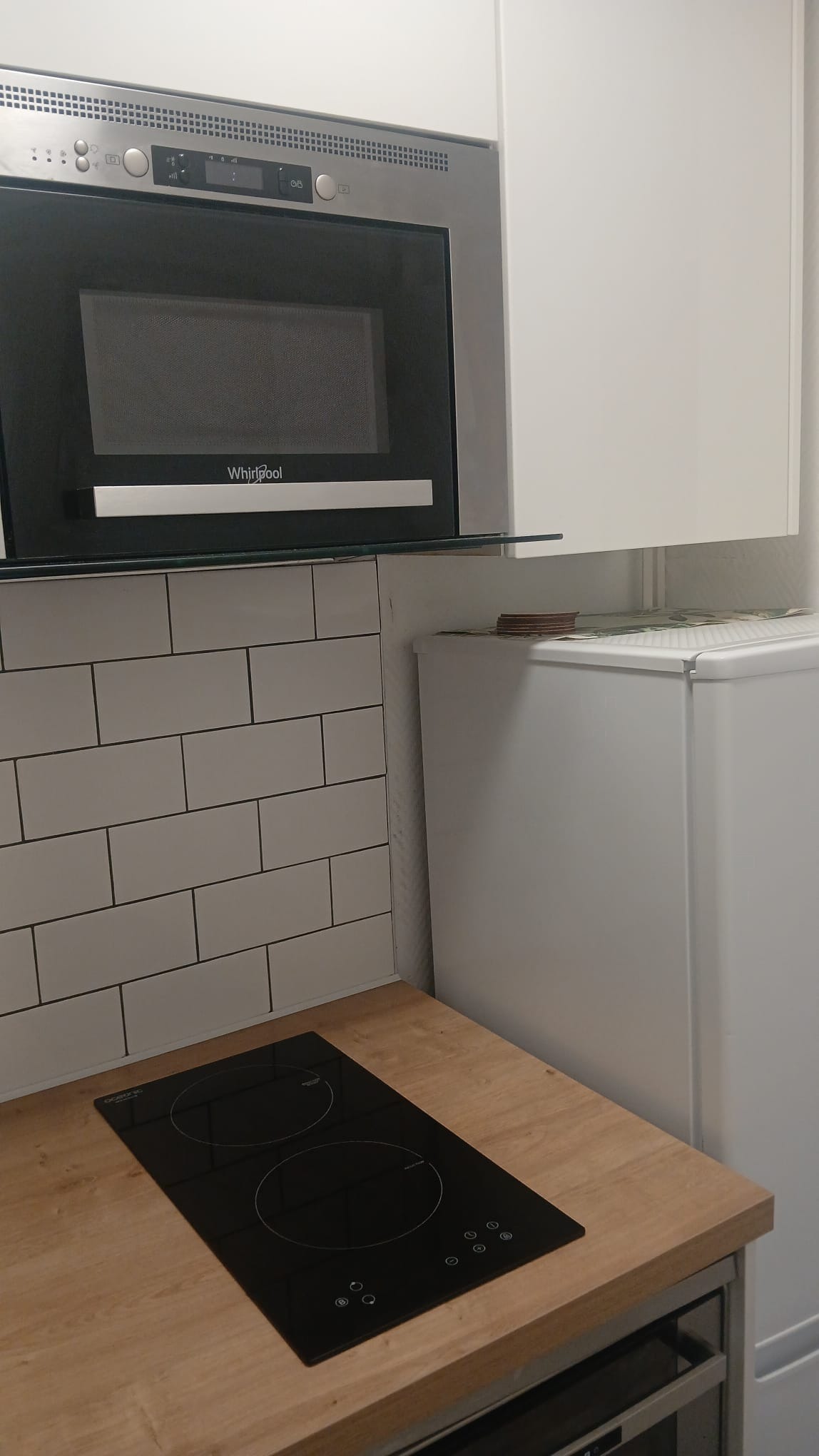Cuisine entièrement équipée (plaques, réfrigérateur, micro-ondes, rangements)