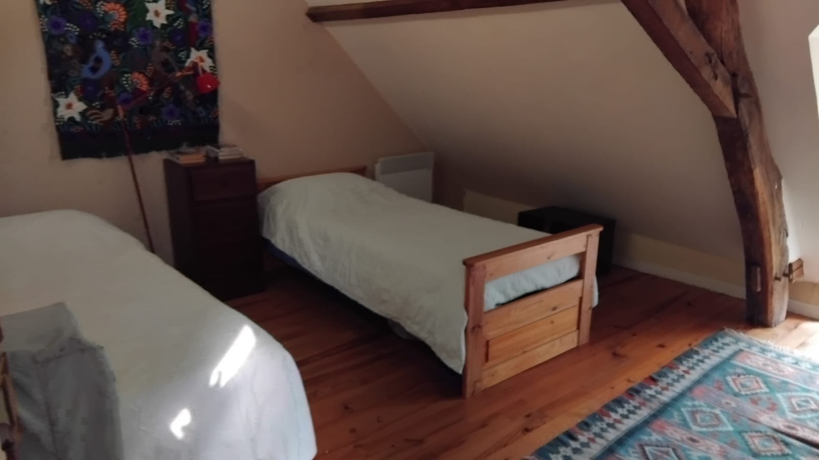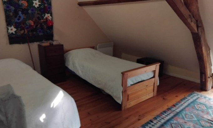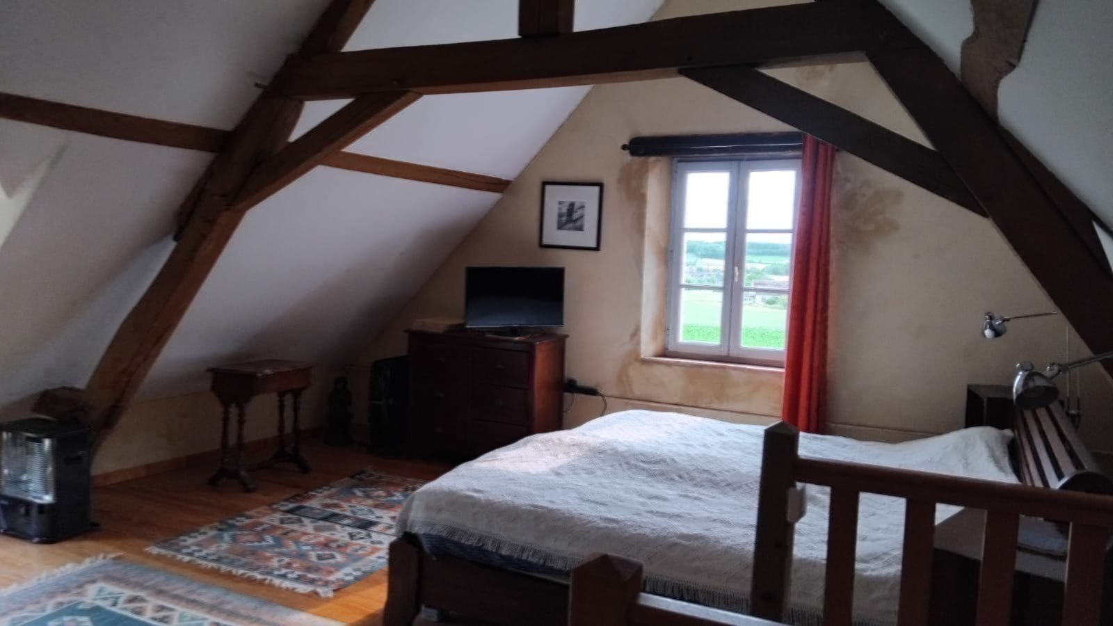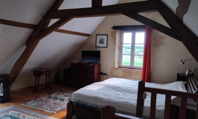 Une grande chambre sous combles dévoile une superbe charpente apparente et une vue dégagée sur la campagne.