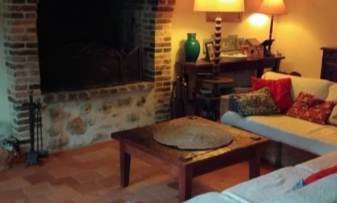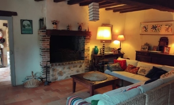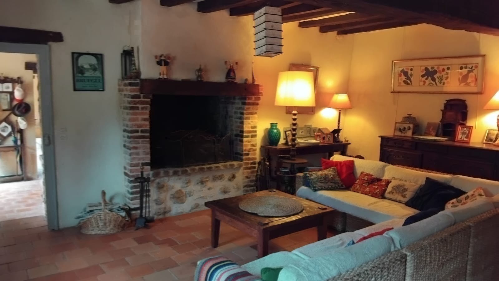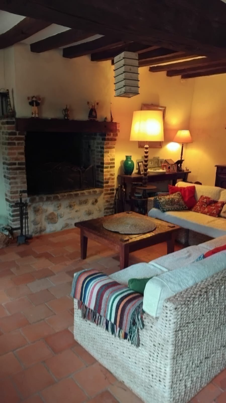 L'entrée, marquée par un ancien four à pain, ouvre sur un vaste salon avec cheminée, poutres apparentes et murs en pierre.