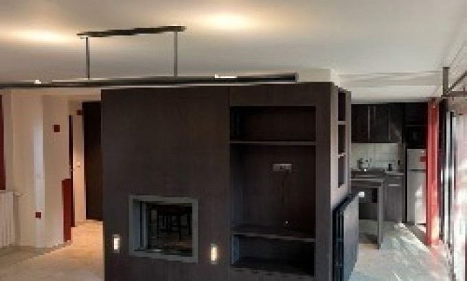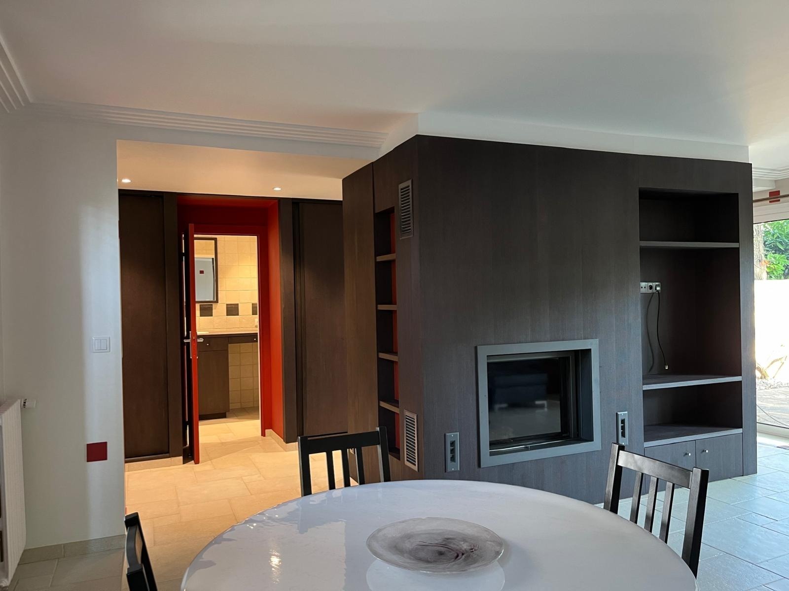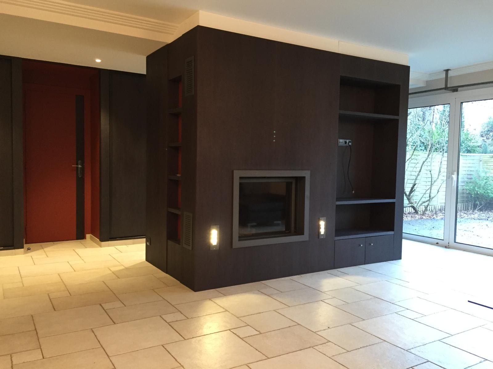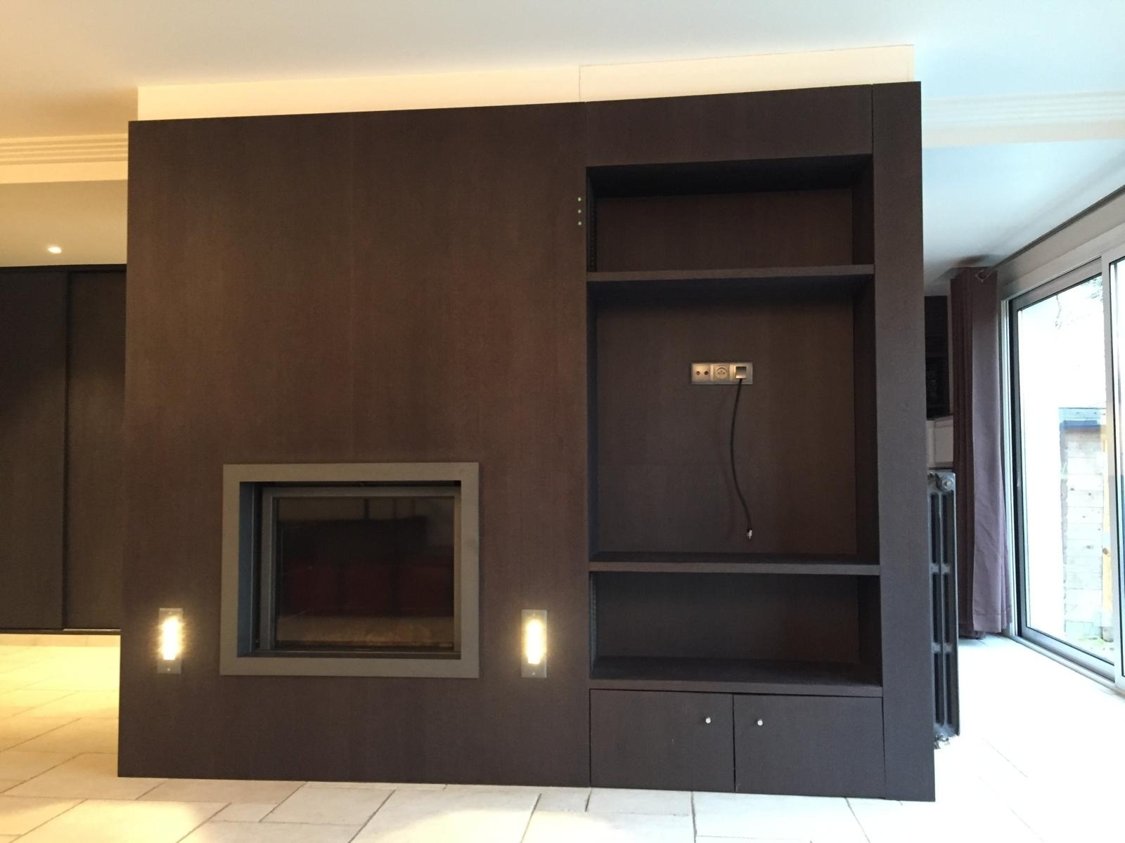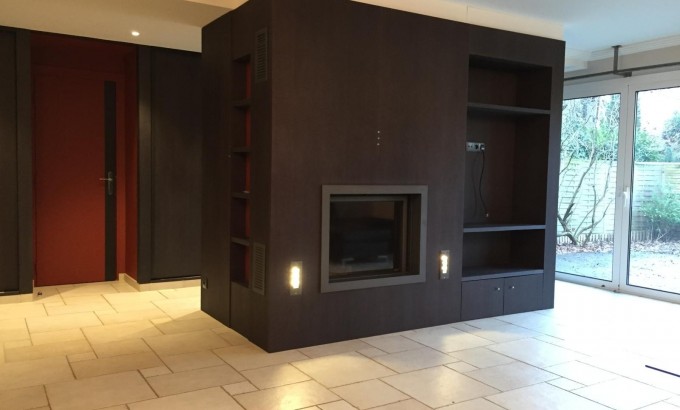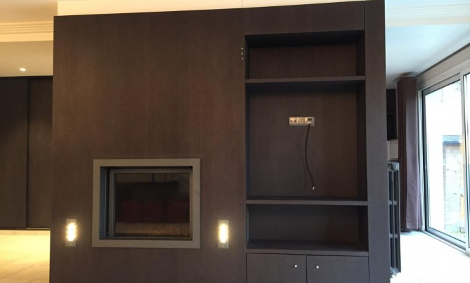 Un grand séjour double avec cheminée contemporaine intégrée dans un îlot central décoratif de rangements