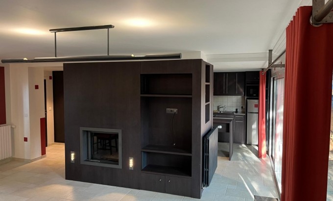 Une cuisine aménagée et équipée donnant également sur la terrasse : plaque induction 4 feux, four encastré, hotte reliée en toiture, micro-ondes, réfrigérateur-congélateur, emplacement lave-vaisselle, nombreux rangements et table/bar. Vaisselle et batterie de cuisine fournies