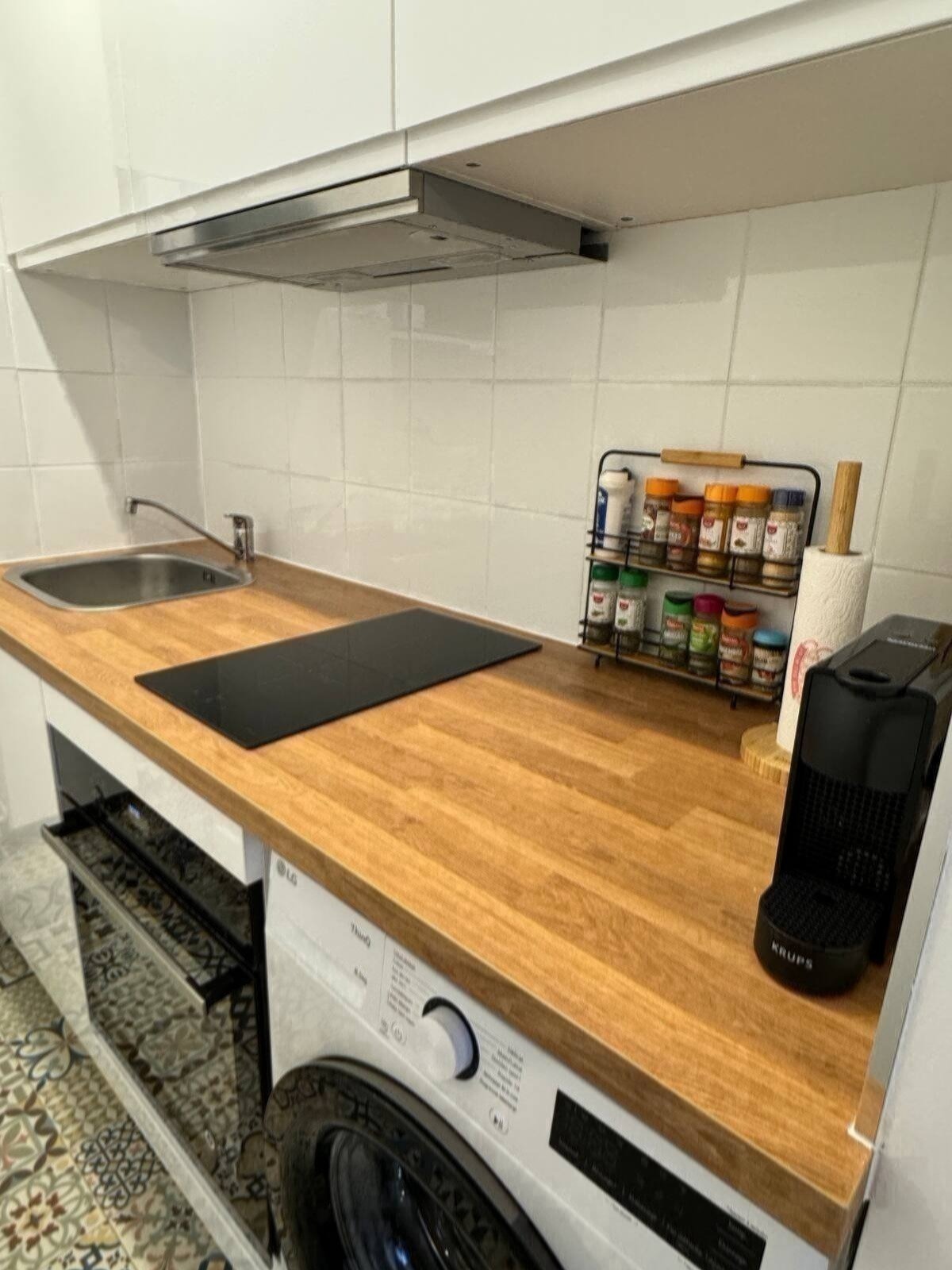 Une cuisine séparée et entièrement équipée (plaques, four, micro-ondes, machine à café, lave-linge, réfrigérateur design rétro)
