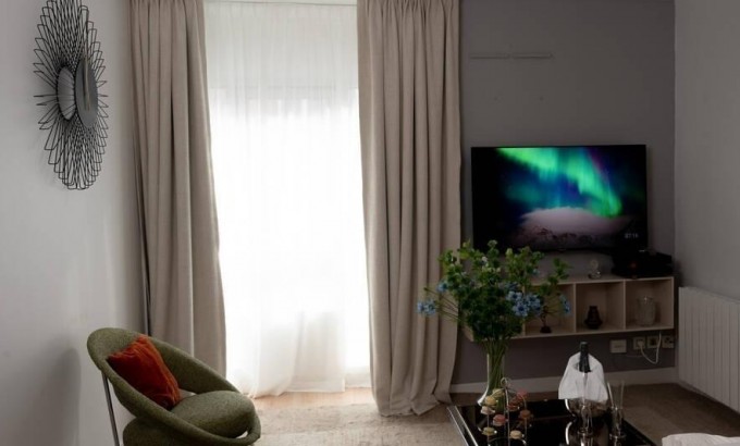 Il se compose d'une entrée, d'un séjour spacieux et confortable avec canapé convertible, table de salon, fauteuil et télévision écran plat, ainsi que d'une cuisine entièrement équipée comprenant lave-linge, four, plaques de cuisson, réfrigérateur et équipements du quotidien.