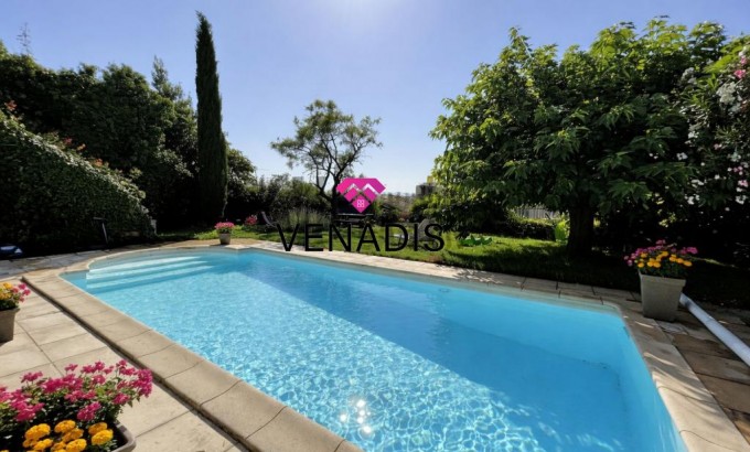 Côté extérieur, le jardin accueille un bassin de nage de 10 x 4 m offrant une échappée visuelle sur la Vallée du Rhône.